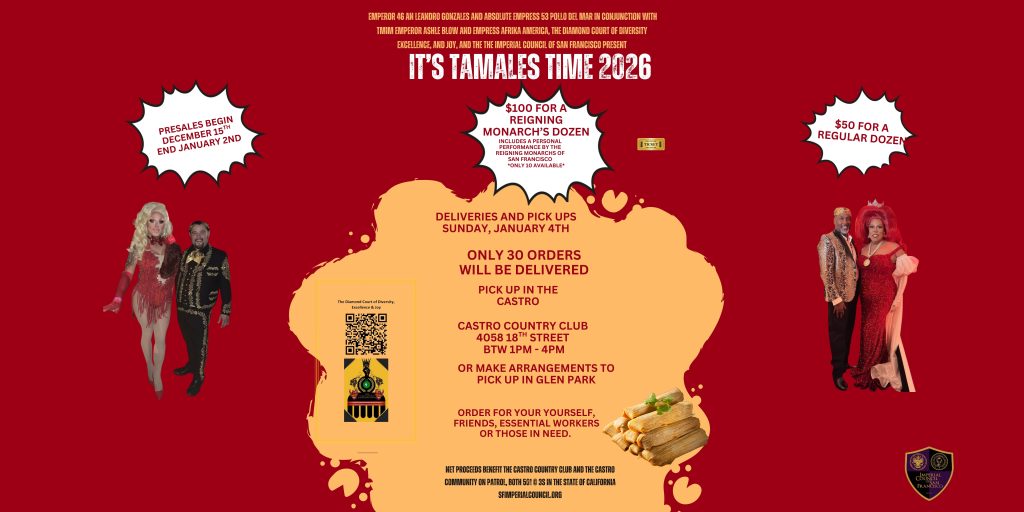 Deliveries will start at 11 AM on January 4th and continue throughout the afternoon, exclusively for San Francisco and nearby areas! You’ll also enjoy the convenience of pickup spots in Glen Park and the Castro District. After placing your order, we’ll share all the details for a smooth pickup experience! Plus, every purchase or donation earns you name recognition at our annual coronation ball in our tamale time ad. Net proceeds equally benefit the Castro Country Club and Castro Community on Patrol, both of which are 501c3 non-profits in the State of California. Totals from the event will be counted towards the Monarch’s Charity Fund total count, part of the Imperial Council of San Francisco